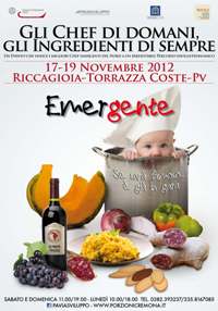 Torna dal 17 al 19 novembre la terza edizione di “Emergente”, la gara per eleggere il miglior chef emergente del Nord Italia. Negli splendidi spazi della tenuta Riccagioia a Torrazza Coste (tra Casteggio e Voghera) si sfideranno i 16 migliori chef giovani del Nord Italia. I visitatori potranno ammirarli dal vivo mentre preparano le loro creazioni. Potranno inoltre degustrare i vini delle migliori cantine dell’Oltrepò Pavese insieme ai produttori pavesi di eccellenze (salumi, formaggi, dolci). In un’area gourmet chef affermati prepareranno – sabato e domenica dalle 12.00 alle 18.00 - tre piatti, uno dei quali rigorosamente a base di riso. Si potrà partecipare gratuitamente anche a laboratori per imparare a preparare i dolci di Natale, per scoprire i migliori formaggi di montagna e collina, per conoscere tutto su “il cibo degli Dei” il tartufo e sul pinot nero. Ma anche corsi sul “bonsai food” o sul “food design”, sulle forme e i colori della tavola e molto altro ancora...